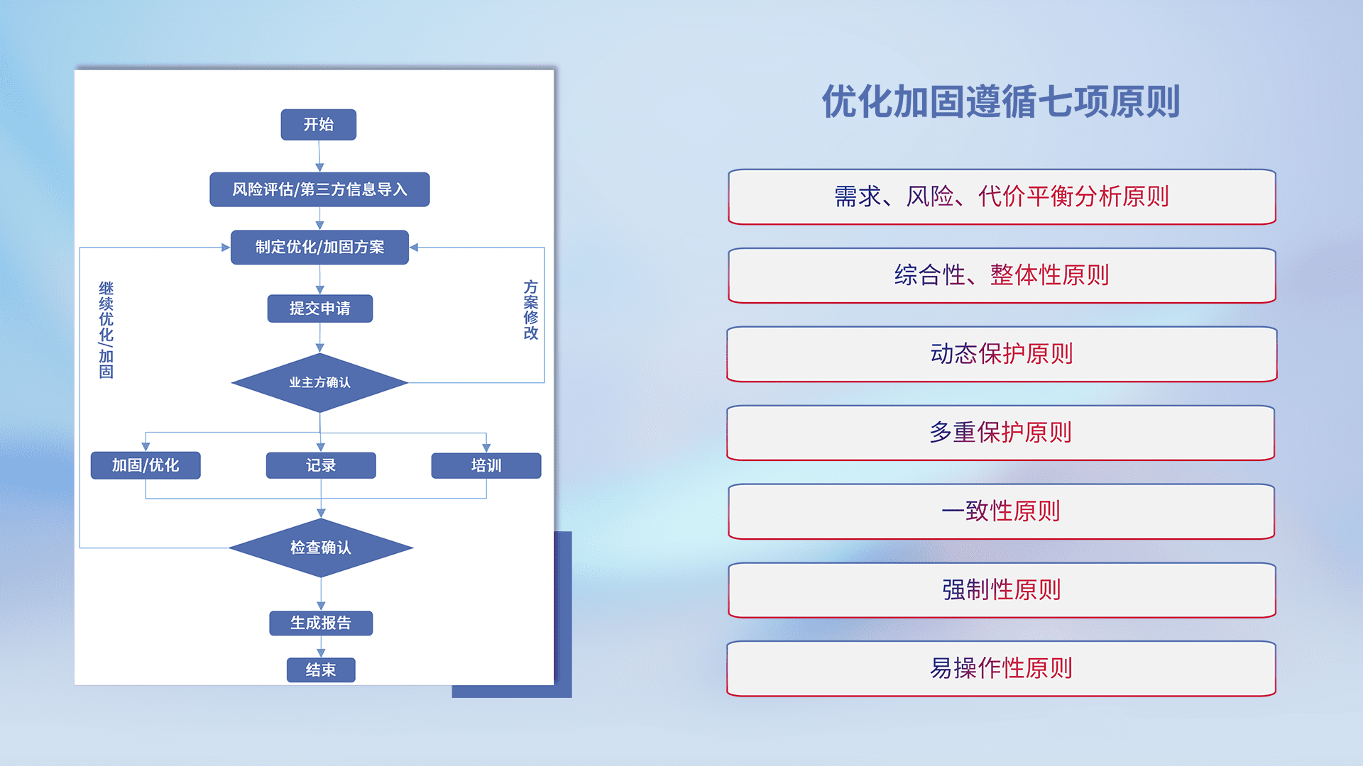 通过专业的法律咨询解读、合规架构体现、差异化解决方案、测试实施支持等服务,为客户量身打造等保合规体系。